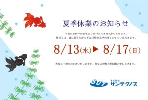 Warning: Undefined property: WP_Error::$category_count in /home/sut2022/sut.co.jp/public_html/wp-content/themes/sut/single.php on line 4 2025夏季休業のお知らせ2 | 株式会社サンテクノス | IT・レントゲン調査・赤外線調査・非破壊検査・超音波検査
