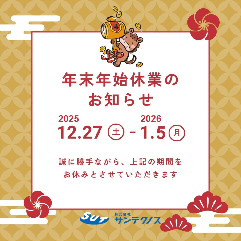 さて、株式会社サンテクノスでは年末年始の休業日につきまして、下記のとおり休業日とさせていただきます。