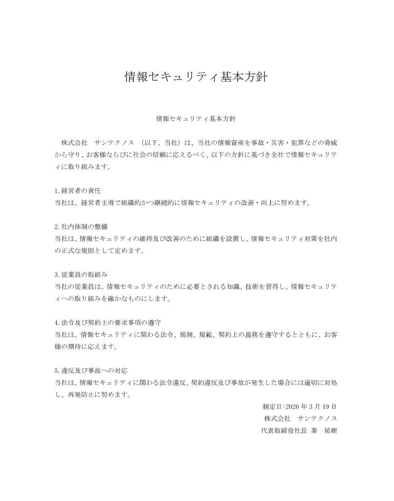 株式会社サンテクノス(以下、当社)は、当社の情報資産を事故・災害・犯罪などの脅威から守り、